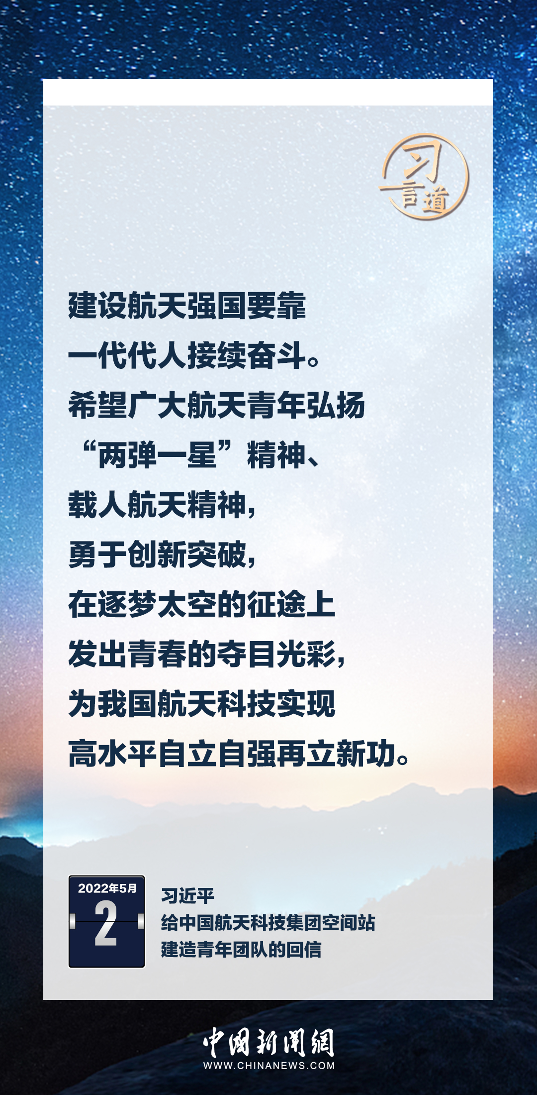 建設(shè)航天強(qiáng)國要靠一代代人接續(xù)奮斗。在不同場合,習(xí)近平總書記頻頻提及航天精神,激勵(lì)一代代中國人不斷奮進(jìn)、筑夢太空。
