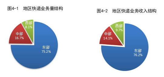 2023年,東、中、西部地區(qū)快遞業(yè)務(wù)量比重分別為75.2%、16.7%和8.1%,業(yè)務(wù)收入比重分別為76.2%、14.1%和9.7%。與去年同期相比,東部地區(qū)快遞業(yè)務(wù)量比重下降1.6個百分點,快遞業(yè)務(wù)收入比重下降1.4個百分點;中部地區(qū)快遞業(yè)務(wù)量比重上升1.0個百分點,快遞業(yè)務(wù)收入比重上升0.7個百分點;西部地區(qū)快遞業(yè)務(wù)量比重上升0.6個百分點,快遞業(yè)務(wù)收入比重上升0.7個百分點。