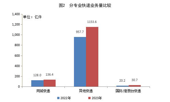 2023年,同城快遞業(yè)務(wù)量累計完成136.4億件,同比增長6.6%;異地快遞業(yè)務(wù)量累計完成1153.6億件,同比增長20.5%;國際/港澳臺快遞業(yè)務(wù)量累計完成30.7億件,同比增長52.0%。