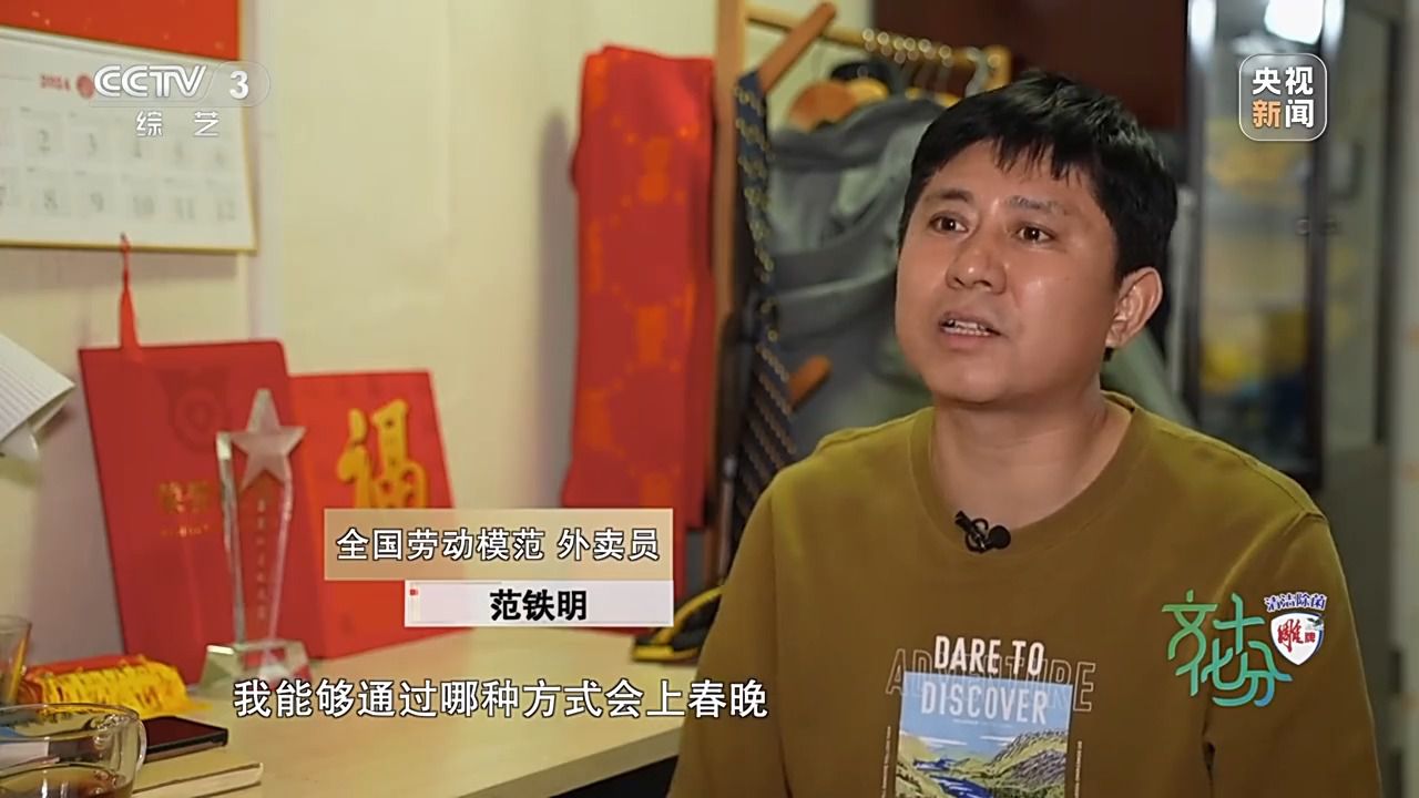 全國勞動(dòng)模范 外賣員 范鐵明:2023年,我被評(píng)為全國最美外賣配送員,這個(gè)獎(jiǎng)項(xiàng),不單純是給我個(gè)人的,實(shí)際上是對(duì)新就業(yè)群體,對(duì)騎手的一個(gè)認(rèn)可。根本就沒有想到我能夠通過哪種方式會(huì)上春晚,因?yàn)槲矣植皇菍I(yè)的演職人員,當(dāng)時(shí)我并不是很相信,我們分配的是《勞動(dòng)最光榮》,它是一個(gè)通過動(dòng)畫片的形式,就是我們兒時(shí)都會(huì)看一些動(dòng)畫片,動(dòng)畫片里都會(huì)有一些主人公,比如說《黑貓警長》當(dāng)中的黑貓警長,《大鬧天宮》里的孫悟空,包括《小貓釣魚》里頭的貓媽媽,當(dāng)然都是我們當(dāng)時(shí)崇拜的一個(gè)對(duì)象,最終我們成為或即將成為他們。