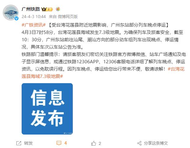 中新網(wǎng)4月3日電 據(jù)中國(guó)鐵路廣州局集團(tuán)有限公司官方微博消息,4月3日7時(shí)58分,臺(tái)灣花蓮縣海域發(fā)生7.3級(jí)地震。為確保列車及旅客安全,截至10:30分,廣州東站前往汕尾、潮汕方向的部分動(dòng)車組列車出現(xiàn)晚點(diǎn)、停運(yùn)情況,具體車次以車站公告為準(zhǔn)。