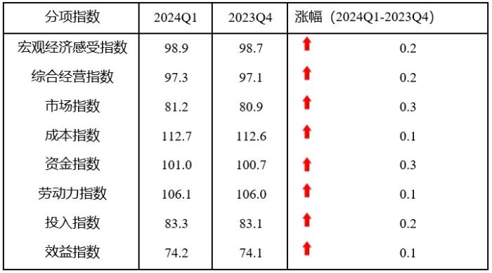 分項(xiàng)指數(shù)全面上升。一季度,宏觀(guān)經(jīng)濟(jì)感受指數(shù)、綜合經(jīng)營(yíng)指數(shù)、市場(chǎng)指數(shù)、成本指數(shù)、資金指數(shù)、勞動(dòng)力指數(shù)、投入指數(shù)和效益指數(shù)均止跌回升,環(huán)比分別上升0.2、0.2、0.3、0.1、0.3、0.1、0.2和0.1點(diǎn)。資金指數(shù)和勞動(dòng)力指數(shù)處于景氣臨界值100以上,宏觀(guān)經(jīng)濟(jì)感受指數(shù)、綜合經(jīng)營(yíng)指數(shù)、市場(chǎng)指數(shù)、投入指數(shù)和效益指數(shù)均處于景氣臨界值100以下,效益指數(shù)一直處于最低位。