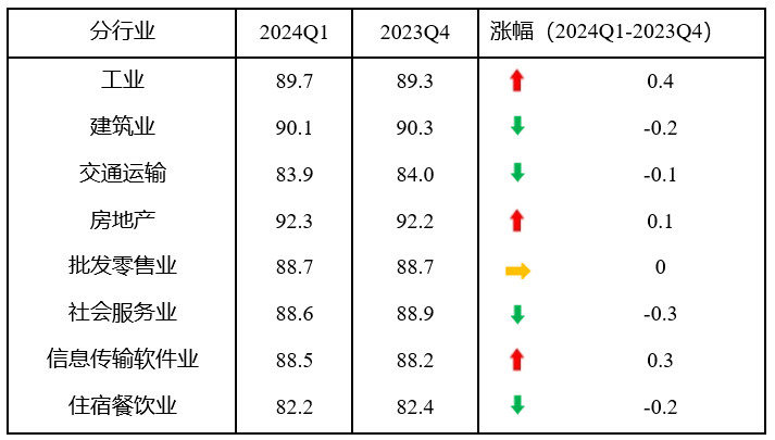 分行業(yè)指數(shù)3升1平4降。一季度,工業(yè)、房地產(chǎn)業(yè)和信息傳輸計(jì)算機(jī)服務(wù)軟件業(yè)指數(shù)比上季度分別上升0.4、0.1和0.3點(diǎn),批發(fā)零售業(yè)指數(shù)持平,建筑業(yè)、交通運(yùn)輸郵政倉(cāng)儲(chǔ)業(yè)、社會(huì)服務(wù)業(yè)和住宿餐飲業(yè)指數(shù)比上季度分別下降0.2、0.1、0.3和0.2點(diǎn),社會(huì)服務(wù)業(yè)指數(shù)降幅較大。8個(gè)分行業(yè)指數(shù)均處于景氣臨界值100以下。