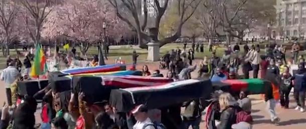 俄羅斯《消息報》發(fā)布的視頻中,一些集會人員抬著蓋有烏克蘭、伊拉克、敘利亞等國國旗的“棺材”,以此指代美國外交政策的“受害者”。