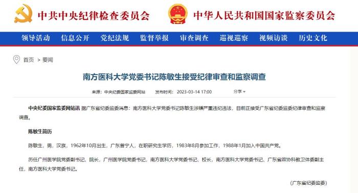 3月14日,中央紀(jì)委國(guó)家監(jiān)委發(fā)布兩則涉及醫(yī)藥衛(wèi)生領(lǐng)域干部被查的消息,落馬官員分別為南方醫(yī)科大學(xué)黨委書(shū)記陳敏生,廣西壯族自治區(qū)醫(yī)療保障局原黨組書(shū)記、局長(zhǎng)王忠平。