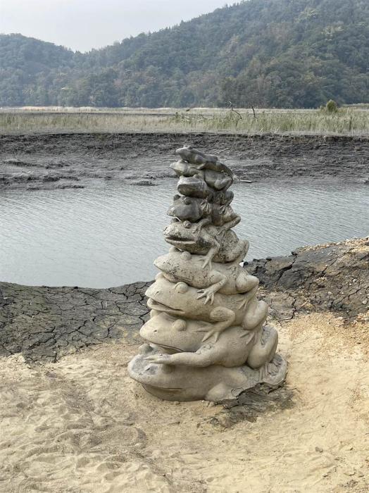日月潭水位驟降,“九蛙疊像”全部上岸。圖片來(lái)源:臺(tái)灣中時(shí)新聞網(wǎng) 楊靜茹 攝