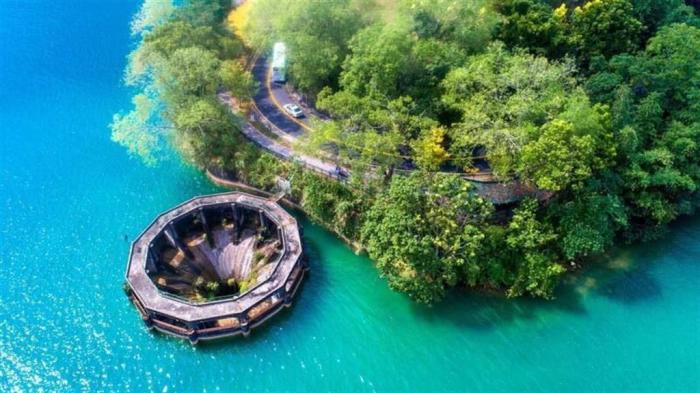 日月潭水位若高于748.5米,過(guò)多的水會(huì)從溢流井排到下游溪流;因此溢流井有“日月潭神秘黑洞”之稱(chēng)。圖片來(lái)源:日月潭風(fēng)管處