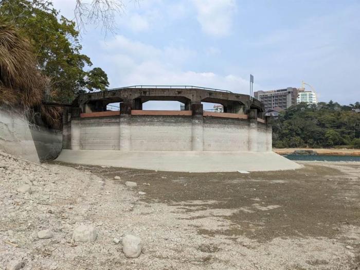 日月潭水位驟降7.4米,溢流井建筑體露出。圖片來(lái)源:臺(tái)灣中時(shí)新聞網(wǎng)