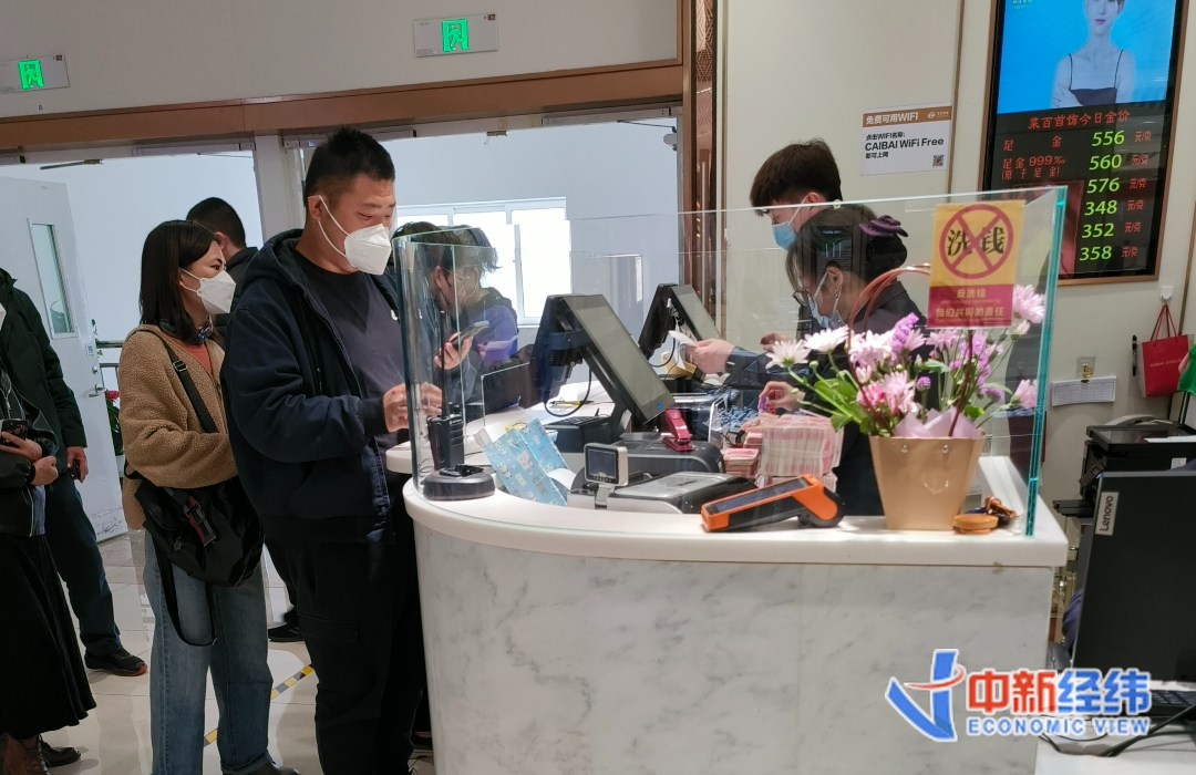 中新經(jīng)緯3月21日電 (馬靜 李自曼 魏薇)“唰唰唰……”兩臺點鈔機的聲響此起彼伏,幾位大媽從布口袋里拿出整整齊齊的幾疊現(xiàn)金放到收銀臺面上,三位收銀員正忙著點鈔、核對小票。這是3月21日早晨十點半左右,北京菜市口百貨四樓投資金條柜臺前的一幕。