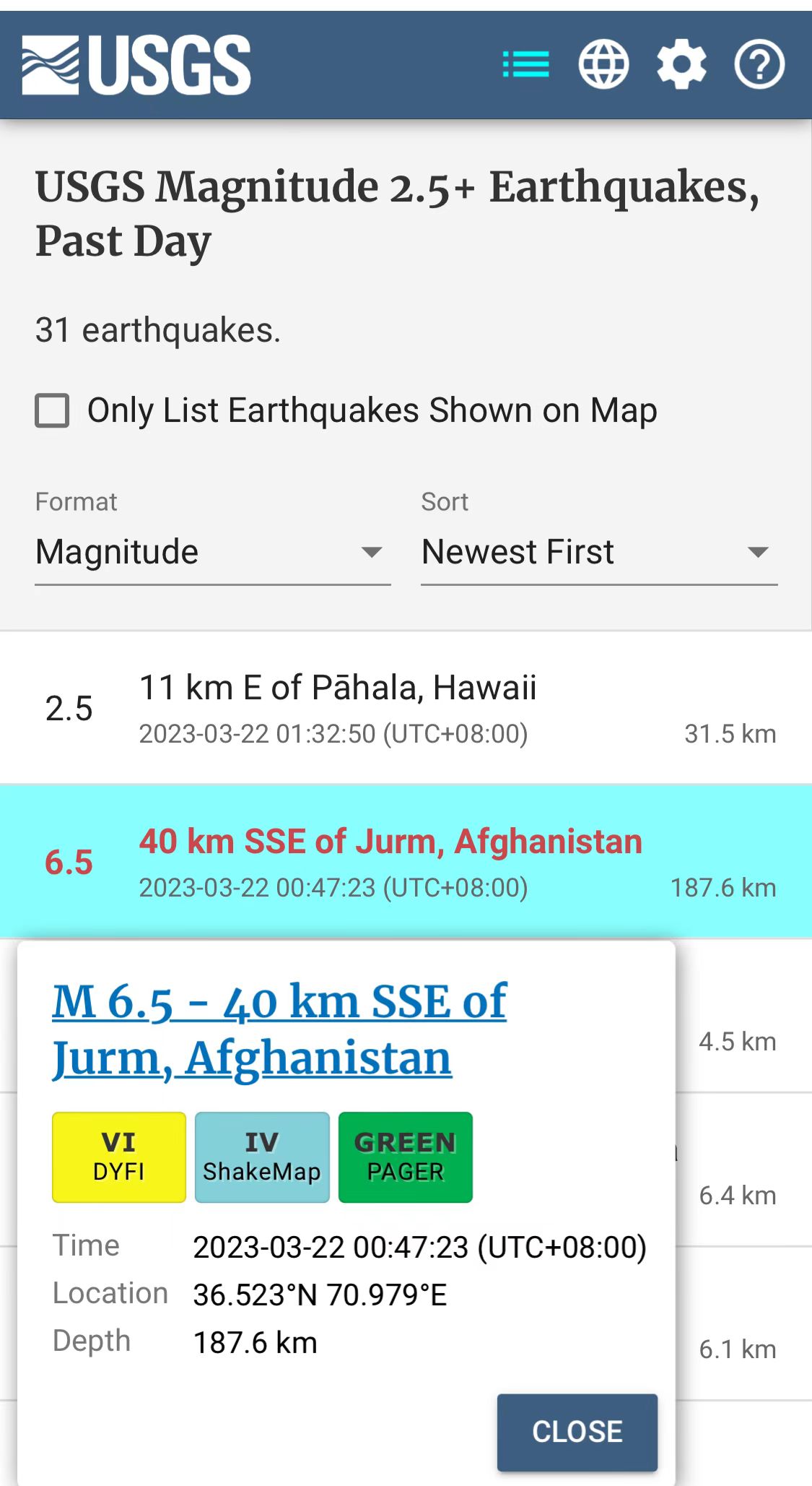 據報道,這場地震發(fā)生在阿富汗東北部巴達赫尚省城鎮(zhèn)尤爾姆東南偏南40公里處,震級里氏6.5級,震源深度187.6公里。