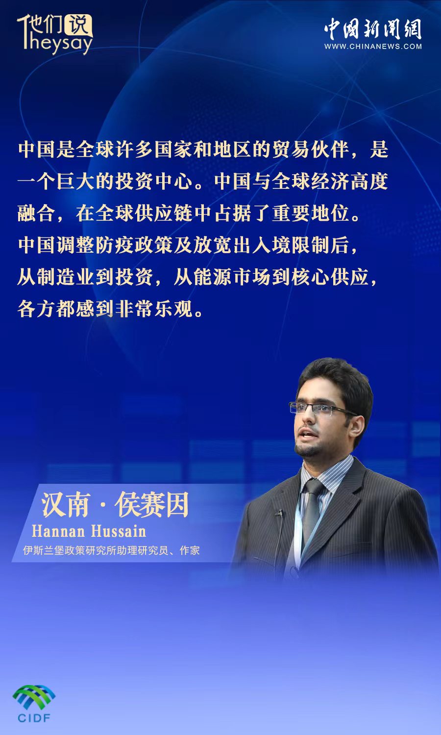 中新網(wǎng)北京3月27日電 (張乃月)“中國將政府和公眾之間的溝通視為一大要素。這使得中國取得了其他國家期望但難以實(shí)現(xiàn)的成功——民眾與政府之間的高度信任。”巴基斯坦伊斯蘭堡政策研究所(IPRI)助理研究員漢南·侯賽因近日在接受中新網(wǎng)采訪時(shí)指出,中國優(yōu)化防疫政策,給全球市場帶來了樂觀情緒。