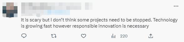 還有人分析,“這很可怕,但我認(rèn)為有些項目不需要停止。技術(shù)正在發(fā)展迅速,負(fù)責(zé)任的創(chuàng)新也是必要的。”