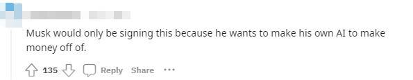 但也有人懷疑馬斯克的動機(jī),“馬斯克之所以會簽署它,因是為他想用自己的人工智能來賺錢?!?/p>