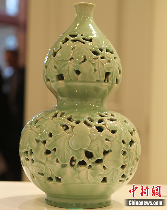圖為展品《葫蔭綿長(zhǎng)》,因其燒制難度大,是公認(rèn)的龍泉青瓷精品。 中新社記者 德永健 攝
