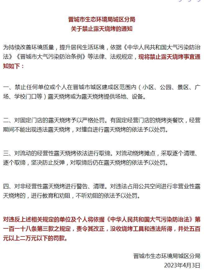 中新網(wǎng)4月10日電 據(jù)山西省晉城市生態(tài)環(huán)境局微信公眾號消息,晉城市生態(tài)環(huán)境局城區(qū)分局10日發(fā)布關(guān)于禁止露天燒烤的通知。通知要求:
