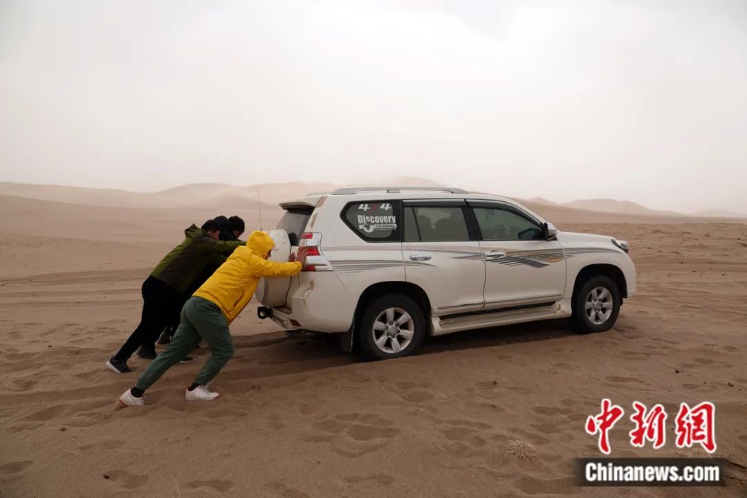 2023年4月,第三次新疆科考阿爾金山野外科考隊一行,前往阿爾金山國家級自然保護區(qū)庫木庫里沙漠的沙子泉考察調(diào)研,遭遇強沙塵暴天氣,科考隊員推車。孫自法 攝