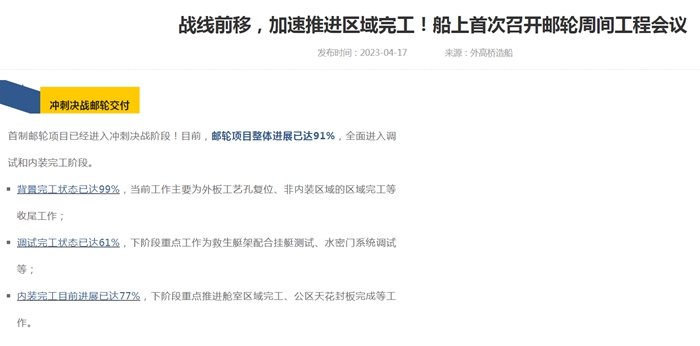 在這之前,3月底,首艘國產大郵輪“誓師保交付”大會舉行,外高橋造船公司黨委委員、副總經理、大型郵輪總建造師周琦表示,堅決完成首制船年底交付的歷史使命。
