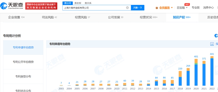 近三年,外高橋造船專利申請數(shù)猛增。天眼查截圖