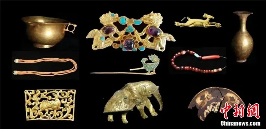墓中出土的人首魚(yú)尾紋金飾片,人物脖頸飾后方飄浮的綬帶,都是典型的波斯薩珊王朝裝飾紋樣。