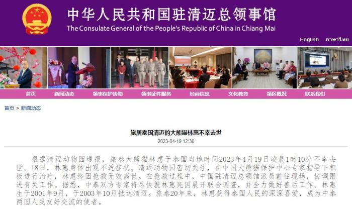 中國(guó)駐清邁總領(lǐng)事館消息稱,4月18日,“林惠”身體出現(xiàn)不適癥狀。清邁動(dòng)物園密切關(guān)注,在中國(guó)大熊貓保護(hù)中心專家指導(dǎo)下積極進(jìn)行治療,“林惠”終因搶救無(wú)效離世。