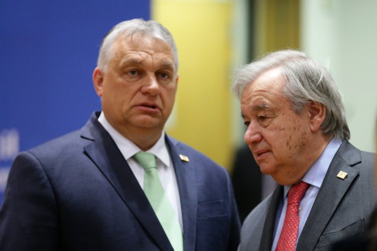 3月23日,在比利時(shí)布魯塞爾的歐盟總部,聯(lián)合國(guó)秘書(shū)長(zhǎng)古特雷斯(右)與匈牙利總理歐爾班在歐盟峰會(huì)開(kāi)始前交談。(新華社記者鄭煥松攝)