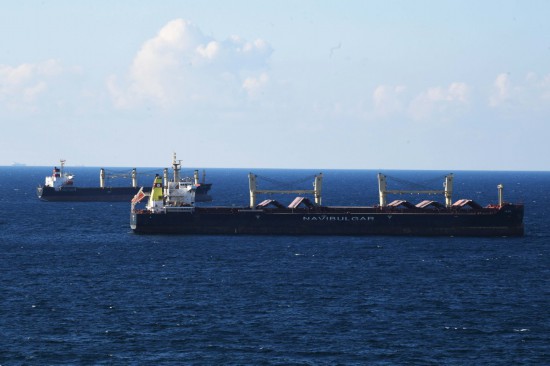 2022年8月6日,從烏克蘭出發(fā)的第二批運(yùn)糧船抵達(dá)土耳其伊斯坦布爾的博斯普魯斯海峽黑海入??诟浇?。(新華社記者沙達(dá)提攝)