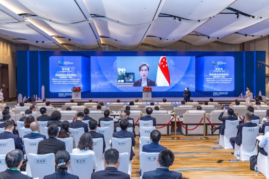 2023年4月20日,在重慶市第五屆中新(重慶)戰(zhàn)略性互聯(lián)互通示范項(xiàng)目金融峰會(huì)開幕式現(xiàn)場,新加坡通訊及新聞部部長、內(nèi)政部第二部長楊莉明線上致辭。新華社記者 黃偉 攝
