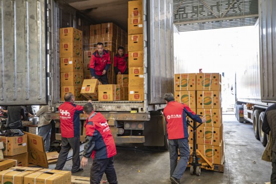 在重慶市江津區(qū)雙福農(nóng)貿(mào)城,洪九果品的工作人員在搬運(yùn)從泰國運(yùn)輸過來的榴蓮(2022年4月19日攝)。新華社記者 黃偉 攝
