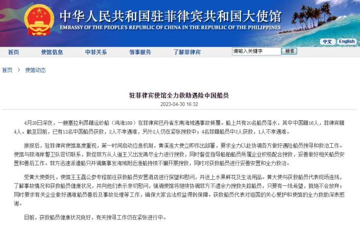 中新網(wǎng)4月30日電 據(jù)中國(guó)駐菲律賓大使館網(wǎng)站消息,4月28日深夜,一艘塞拉利昂籍運(yùn)砂船(鴻海189)在菲律賓巴丹省東南海域遇事故傾覆。船上共有20名船員落水,其中中國(guó)籍16人,菲律賓籍4人。截至目前,已有12名中國(guó)船員獲救,2人不幸遇難,另外2人仍在緊張搜救中;4名菲籍船員中3人獲救,1人不幸遇難。