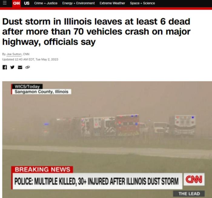 中新網(wǎng)5月2日電 綜合美媒消息,當(dāng)?shù)貢r(shí)間5月1日,由于沙塵暴導(dǎo)致能見度降低,70余輛汽車在美國伊利諾伊州55號(hào)州際公路蒙哥馬利縣法默斯維爾鎮(zhèn)附近路段相撞,事故已造成至少6人死亡,37人受傷入院。