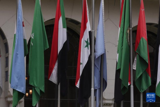 這是5月7日在位于埃及開羅的阿拉伯國(guó)家聯(lián)盟總部拍攝的敘利亞國(guó)旗(左四)。新華社發(fā)(艾哈邁德·戈馬 攝)