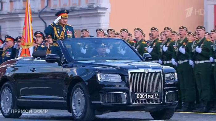 俄國(guó)防部長(zhǎng)紹伊古乘車檢閱。圖片來(lái)源:俄羅斯第一頻道視頻截圖