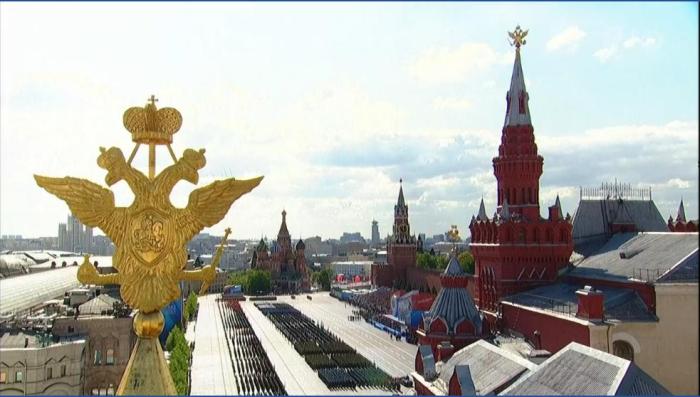 在《神圣的戰(zhàn)爭(zhēng)》樂(lè)曲的伴奏下,儀仗隊(duì)護(hù)衛(wèi)著俄羅斯國(guó)旗和勝利旗幟走進(jìn)紅場(chǎng)。