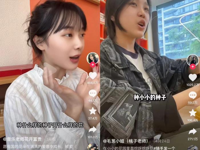 中新網(wǎng)查詢了她們在短視頻平臺上最早發(fā)布時(shí)間,桃子老師是在4月24日,黃老師是在4月28日。