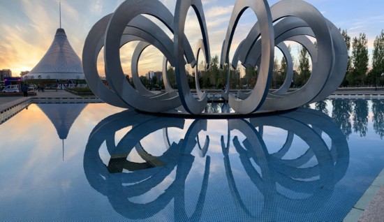 ↑哈薩克斯坦首都阿斯塔納的雕塑和遠(yuǎn)處的“可汗之帳”購(gòu)物中心。