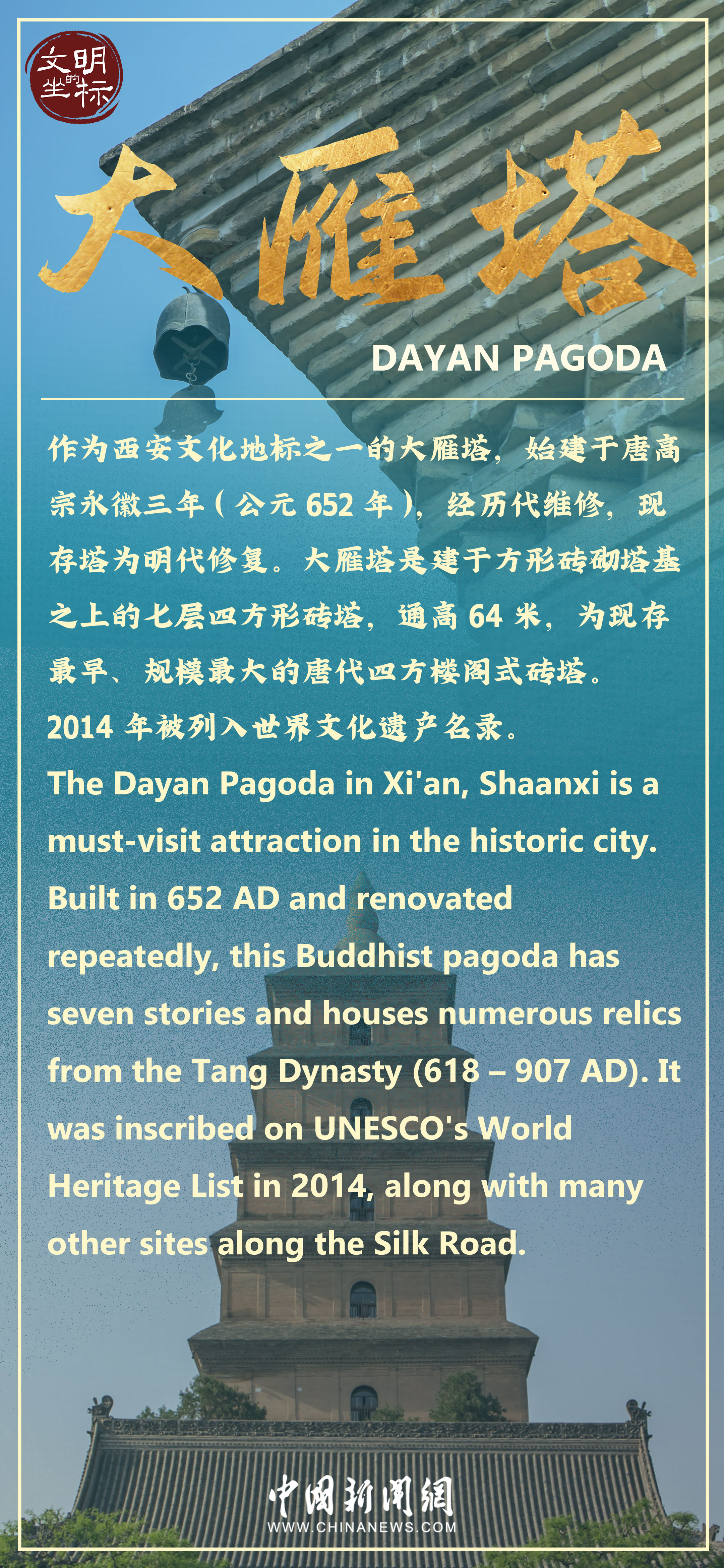 大雁塔又稱大慈恩寺塔,位于陜西省西安市雁塔區(qū),始建于唐高宗永徽三年(公元652年),為七層四方樓閣式磚塔。大雁塔現(xiàn)塔身通高64米,是為保存玄奘法師經(jīng)絲綢之路帶回長安的經(jīng)卷佛像而建,塔下碑文記述和佐證了大雁塔與絲綢之路佛教傳播的歷史。整個(gè)建筑氣魄宏大,莊嚴(yán)古樸,是唐代建筑藝術(shù)的杰作。走近大雁塔,感受“塔勢如涌出,孤高聳天宮”的氣勢,觸摸“曲江流飲,雁塔題名”的歷史文脈。