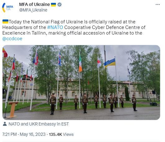烏克蘭外交部在推特上發(fā)布圖片并配文稱,“今天,烏克蘭國旗在位于塔林的北約合作網(wǎng)絡(luò)防御卓越中心總部正式升起,標(biāo)志著烏克蘭正式加入該組織。”