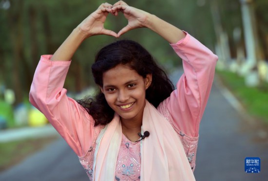 5月26日,在孟加拉國(guó)首都達(dá)卡,阿里法·沁做出愛(ài)心手勢(shì)表達(dá)對(duì)中國(guó)的愛(ài)意。新華社發(fā)