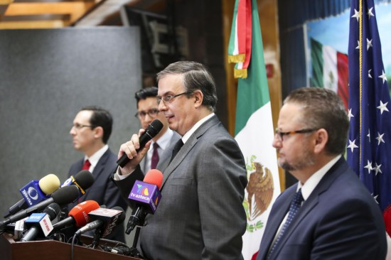 2019年8月5日,在美國得克薩斯州埃爾帕索的墨西哥駐埃爾帕索領(lǐng)事館,墨西哥外長(zhǎng)埃布拉德(左三)在記者會(huì)上講話。新華社記者王迎攝