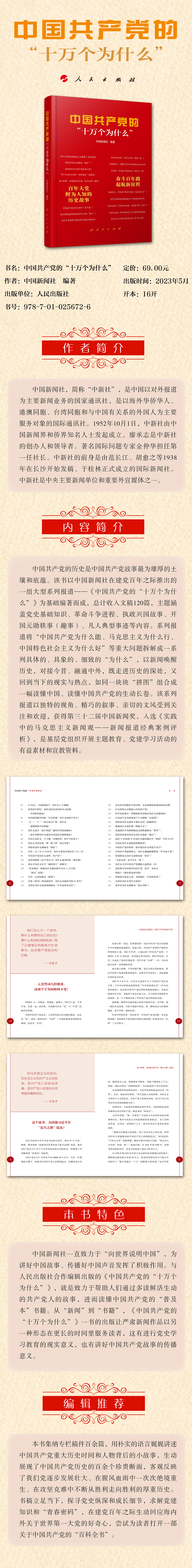 中國新聞社一直致力于“向世界說明中國”,為講好中國故事、傳播好中國聲音發(fā)揮了積極作用。與人民出版社合作編輯出版的《中國共產(chǎn)黨的“十萬個(gè)為什么”》,就是致力于幫助人們通過多讀鮮活生動(dòng)的共產(chǎn)黨人的故事,進(jìn)而讀懂中國共產(chǎn)黨的“普及本”書籍。從“新聞”到“書籍”,《中國共產(chǎn)黨的“十萬個(gè)為什么”》一書的出版讓嚴(yán)肅新聞作品以另一種形態(tài)在更長的時(shí)間里服務(wù)讀者,這有進(jìn)行黨史學(xué)習(xí)教育的現(xiàn)實(shí)意義,也有講好中國共產(chǎn)黨故事的傳播意義。