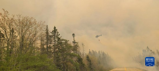 5月31日,在加拿大新斯科舍省謝爾本縣巴靈頓湖附近,一架飛機(jī)飛過(guò)野火上空。新華社發(fā)(新斯科舍省政府供圖)