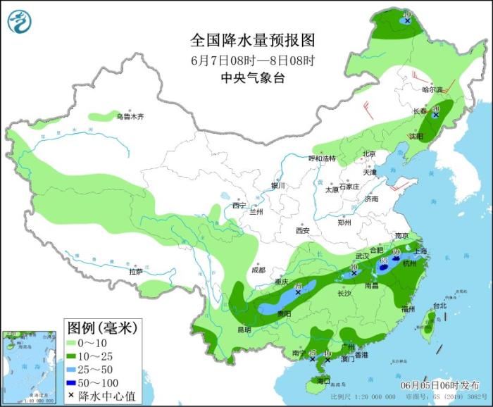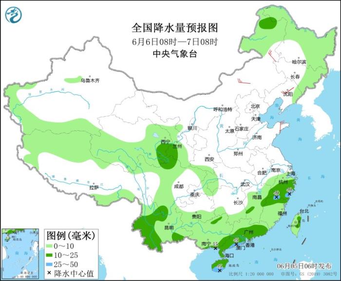 6月6日08時(shí)至7日08時(shí),內(nèi)蒙古東北部、東北地區(qū)東部和北部、青藏高原北部、甘肅中南部、江南東部和南部、西南地區(qū)大部、華南、臺灣島等地部分地區(qū)有小到中雨,局地有大雨(25~45毫米)。內(nèi)蒙古中東部、東北地區(qū)南部、山東半島等地部分地區(qū)有4~5級風(fēng)(見圖2)。