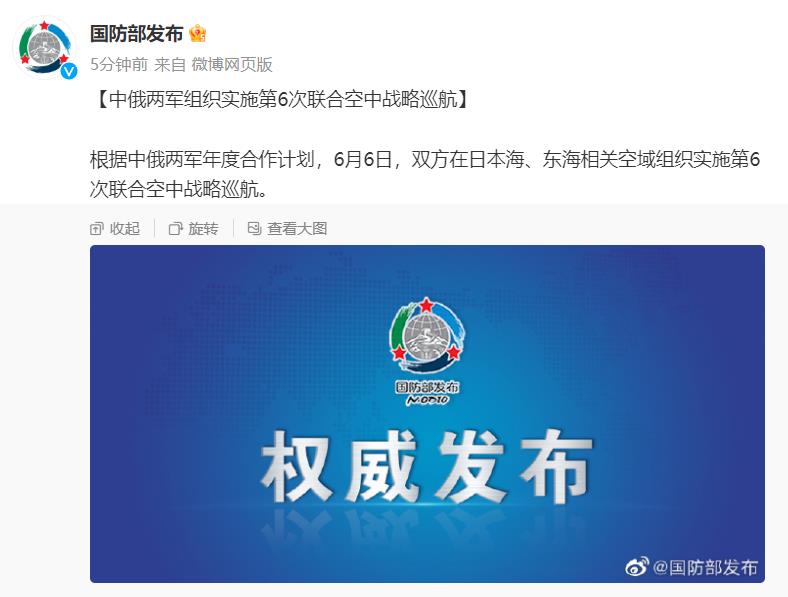 中新網(wǎng)6月6日電 據(jù)國防部新聞局官方微博消息,根據(jù)中俄兩軍年度合作計劃,6月6日,雙方在日本海、東海相關空域組織實施第6次聯(lián)合空中戰(zhàn)略巡航。