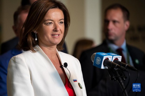 6月6日,在位于紐約的聯(lián)合國總部,斯洛文尼亞外長塔尼婭·法永在斯洛文尼亞當(dāng)選聯(lián)合國安理會非常任理事國后在記者見面會上講話。新華社發(fā)(聯(lián)合國供圖/洛伊·費利佩攝)