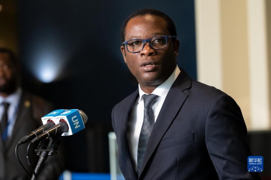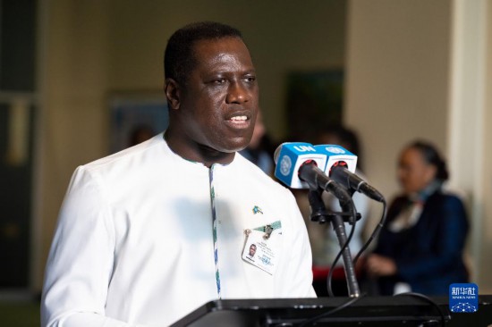 6月6日,在位于紐約的聯(lián)合國總部,塞拉利昂外交與國際合作部長弗朗西斯在塞拉利昂當(dāng)選聯(lián)合國安理會非常任理事國后在記者見面會上講話。新華社發(fā)(聯(lián)合國供圖/洛伊·費利佩攝)