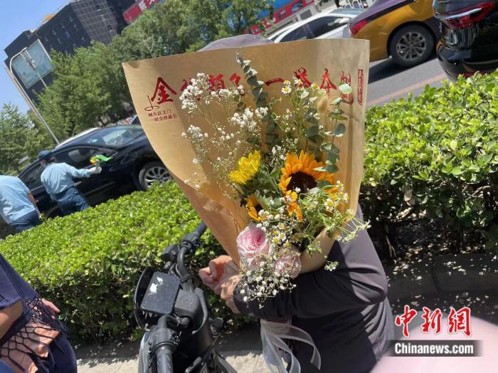 考試當(dāng)天,中新網(wǎng)見到不少家長手捧鮮花等待迎接考生。看見小楊手上的“向日葵”和宣傳語,原本并沒準(zhǔn)備花束的一位母親當(dāng)即決定購買。