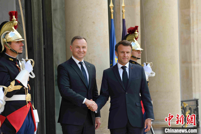 當(dāng)晚舉行的會談是“魏瑪三角”機(jī)制下的領(lǐng)導(dǎo)人會議。馬克龍?jiān)诎屠钀埯惿釋m分別與杜達(dá)和朔爾茨會面,隨后三人共同出席新聞發(fā)布會,接著還共進(jìn)工作晚餐。