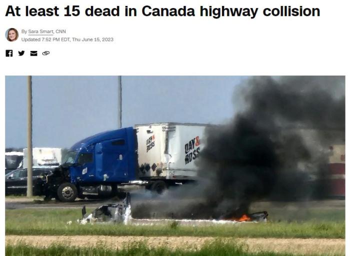 曼尼托巴省警官羅布·希爾表示,一輛載有大約25人的巴士在交叉路口與一輛半掛卡車相撞,至少15人確認死亡,另有大約10人被送往醫(yī)院。希爾補充說,巴士上大多數是老年乘客。