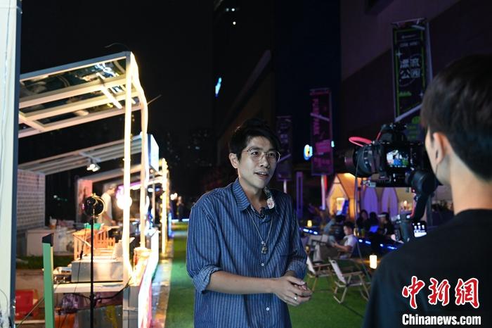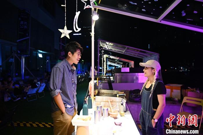 夜幕下的深圳市南山區(qū)人潮涌動,一處集合了美食、潮流、游戲等元素的市集內,臺灣青年周伯彥正與幾位工作人員一起檢查場地布置和物料擺放,為市集營業(yè)做最后的準備。