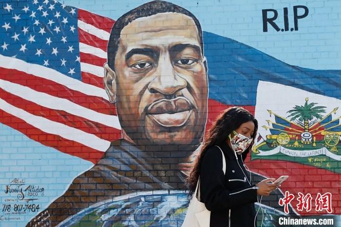 資料圖:美國紐約布魯克林區(qū)一位市民走過弗洛伊德畫像。 中新社記者 廖攀 攝